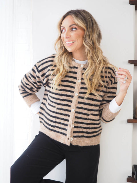 Adiciona estilo e conforto ao teu guarda-roupa com o Casaco de Malha às Riscas da Black Peach Store, ideal para looks modernos e cozy durante todas as estações.Com um padrão de riscas clássico e versátil, este casaco combina elegância casual com funcionalidade, tornando-se uma peça essencial para quem procura moda feminina confortável e trendy. O colarinho redondo e o fecho de botões frontal adicionam um detalhe clássico, enquanto os pequenos bolsos frontais oferecem funcionalidade sem comprometer o design.Este casaco feminino às riscas é perfeito para combinar com calças, saias ou jeans, criando looks descontraídos ou mais sofisticados para o dia-a-dia.