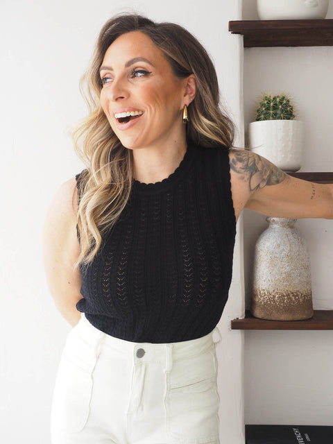 Top de malha leve e confortável, com manga cava e gola redonda clássica, perfeito para os dias mais quentes. O design inclui um elegante pormenor perfurado, que acrescenta um toque de sofisticação e leveza ao visual, ao mesmo tempo que garante maior respirabilidade. A silhueta é simples e versátil, ideal para combinar com calças, saias ou calções, seja num look casual ou mais composto. Um essencial de verão com um detalhe que faz a diferença.