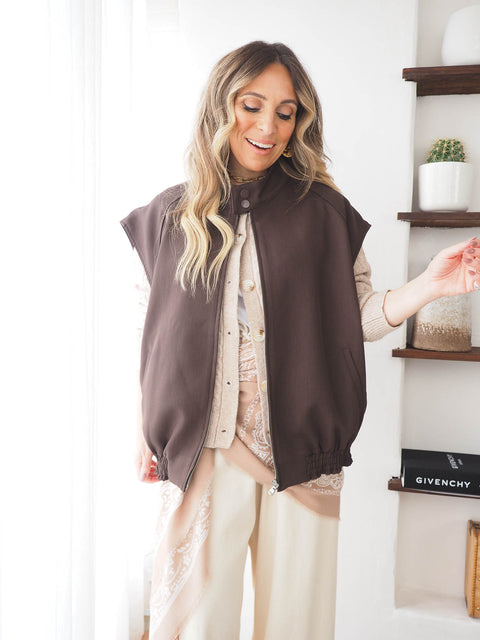 colete feminino, colete com fecho de correr mulher, colete moderno feminino, colete com gola mulher, colete manga cava larga, colete feminino com bolsos, colete casual mulher, colete tendência feminino, colete confortável mulher, colete com elástico na cintura.