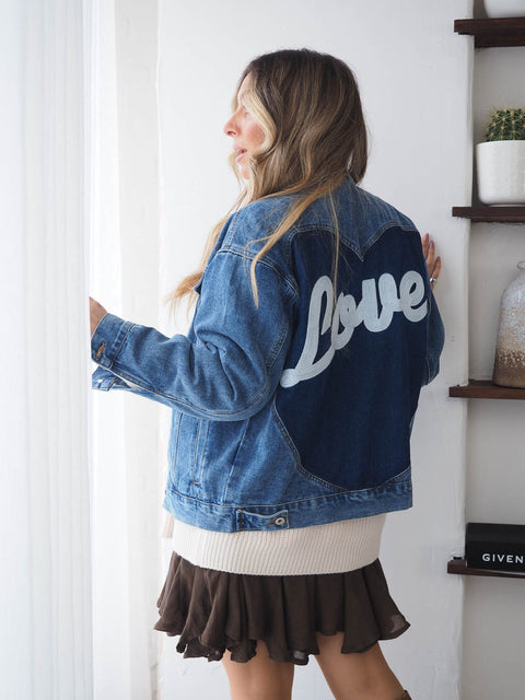Casaco de ganga feminino, blusão de ganga com desenho, casaco denim com coração, casaco de ganga Love, casaco com bolsos à frente, moda denim feminina.