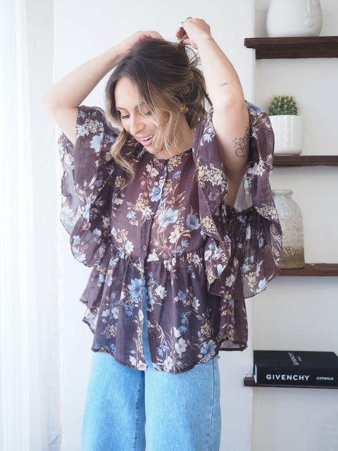 Romântica, leve e cheia de charme, esta blusa florida semi-transparente é a escolha ideal para quem procura uma peça feminina e delicada com um toque sofisticado. Confeccionada em tecido leve e vaporoso, esta blusa destaca-se pelo seu padrão floral, que acrescenta frescura e alegria ao visual. A semi-transparência subtil adiciona um toque sensual sem perder a elegância, tornando-a perfeita tanto para o dia como para a noite. A gola redonda oferece um acabamento suave e discreto ao decote, enquanto o fecho frontal com botões garante praticidade e permite ajustar o estilo conforme a ocasião — mais fechado para um look clássico, ou ligeiramente aberto para um toque descontraído. As mangas largas com folho são o grande destaque da peça: fluídas, românticas e com movimento, conferem leveza e personalidade ao visual, elevando instantaneamente qualquer coordenado. Ideal para combinar com jeans, saias ou calças de cintura subida, esta blusa adapta-se a múltiplos estilos — do casual chic ao mais elegante. Um essencial para quem aprecia detalhes delicados e looks femininos com atitude.