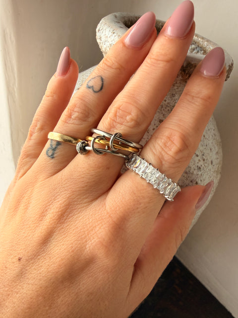 anel triplo feminino, anel dourado triplo, anel prateado triplo, anel moderno feminino, anel elegante feminino, joalharia feminina, anel minimalista, acessório feminino, anel versátil