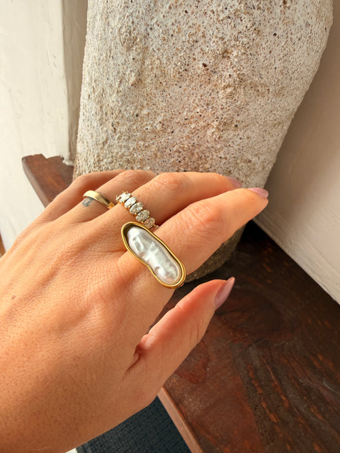 anel dourado feminino, anel com pedra madre pérola, anel madre pérola grande, anel elegante feminino, anel sofisticado feminino, joalharia feminina, anel luxuoso feminino, acessório feminino dourado, anel moderno feminino