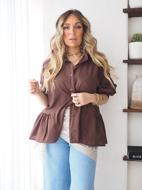 Discover the perfect combination of elegance and comfort with this women's cotton shirt, an essential piece for a modern and versatile wardrobe. Featuring a button-down front and boat neck, this stylish women's shirt stands out for its classic design with a contemporary touch. The cotton fabric ensures breathability and comfort throughout the day, making this women's cotton shirt ideal for both casual looks and more sophisticated combinations. The ruffle detail at the bottom adds movement and femininity to the piece, creating a delicate and modern look. Versatile and easy to combine, this women's button-down shirt can be worn with jeans, skirts, or classic trousers, adapting perfectly to different styles and occasions. If you are looking for an elegant, comfortable, and trendy women's cotton shirt with ruffles, this model is the perfect choice to add a sophisticated touch to your everyday looks.