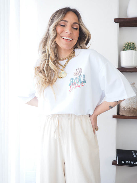 Aposta num look moderno e cheio de personalidade com esta t-shirt branca comprida feminina com estampado de brilhos. Perfeita para quem procura conforto sem abdicar do estilo, esta t-shirt longa de manga curta destaca-se pelo seu design versátil e pelo estampado com aplicação de brilhos, que acrescenta um toque sofisticado e trendy ao visual. Confeccionada em tecido leve e confortável, esta t-shirt feminina branca comprida oferece um caimento fluido e descontraído, ideal para usar no dia a dia. O comprimento alongado permite utilizá-la como t-shirt oversized, combinando facilmente com leggings, jeans, calções ou até como vestido casual em looks mais ousados. O estampado brilhante feminino torna esta peça perfeita tanto para outfits casuais como para coordenados mais elegantes, adaptando-se a diferentes ocasiões — desde o streetwear ao casual chic