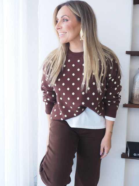 Pull en maille à pois. Pull en maille pour femme. Chemise à manches longues. Pull à col rond. Pull confortable pour femme. Vêtements en maille décontractés pour femme. Pull fantaisie pour femme. Mode femme en ligne. Pull basique et élégant.