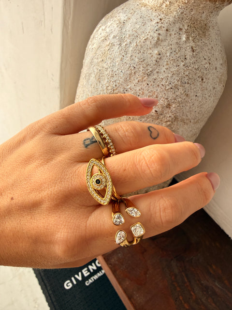 O anel dourado feminino com olho turco e brilhantes é a escolha ideal para quem procura proteção, estilo e sofisticação em um só acessório. Com acabamento dourado luminoso e um olho turco central decorado com brilhantes, este anel combina simbolismo, elegância e modernidade.