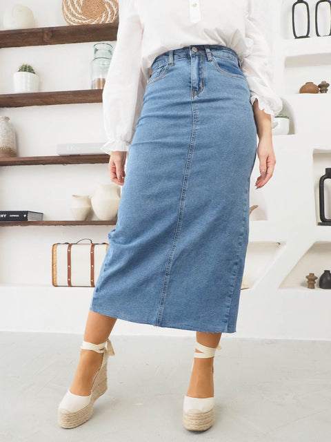 La jupe midi en jean idéale au quotidien. Notre jupe midi en jean est la pièce idéale pour un look décontracté et décontracté. Avec son design classique, elle est dotée de poches avant et arrière, offrant praticité et style à votre look quotidien. La fermeture zippée et boutonnée assure un ajustement sûr et confortable, tandis que la fente arrière apporte une touche moderne et offre une plus grande liberté de mouvement. Confectionnée en denim de haute qualité, cette jupe est polyvalente et facile à associer avec une variété de hauts et de chaussures, parfaite pour toutes les occasions décontractées. Soyez à la fois confortable et tendance avec notre jupe midi en jean.