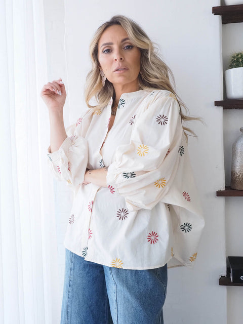 Cette chemise ample à manches courtes ornée de fleurs brodées est idéale pour celles qui recherchent un look léger, frais et plein de personnalité. Avec sa coupe ample et confortable, elle s'adapte facilement à différents styles et silhouettes, offrant une grande liberté de mouvement et une touche décontractée au quotidien. Son col rond lui confère une touche moderne et délicate, idéale pour sublimer le visage et créer des associations polyvalentes, que ce soit avec des accessoires plus discrets ou des colliers imposants. La fermeture boutonnée sur le devant est pratique et permet d'ajuster l'encolure à votre convenance, rendant la chemise encore plus polyvalente pour différentes occasions. Le point fort de cette pièce réside dans ses fleurs brodées, qui apportent une touche artisanale et romantique au modèle. La broderie délicate sublime le look, rendant chaque chemise unique et spéciale, parfaite pour celles qui apprécient les détails qui font la différence.