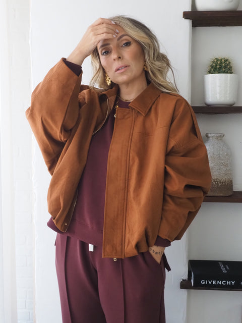 Blusão feminino com corte oversized, confecionado em tecido de efeito camurça suave ao toque. Possui forro interior, fecho frontal com zipper metálico e botão de mola para um acabamento funcional e moderno. O detalhe de elástico na base proporciona ajuste confortável ao corpo e contribui para um visual estruturado com um toque desportivo. Ideal para compor looks casuais com estilo e conforto. Detalhes do Produto: Corte oversized, com visual amplo e descontraído; Tecido com efeito camurça macio e maleável; Fecho frontal em zipper metálico + botão de mola; Elástico na base para ajuste confortável; Gola estruturada e acabamento moderno; Ideal para meia-estação.