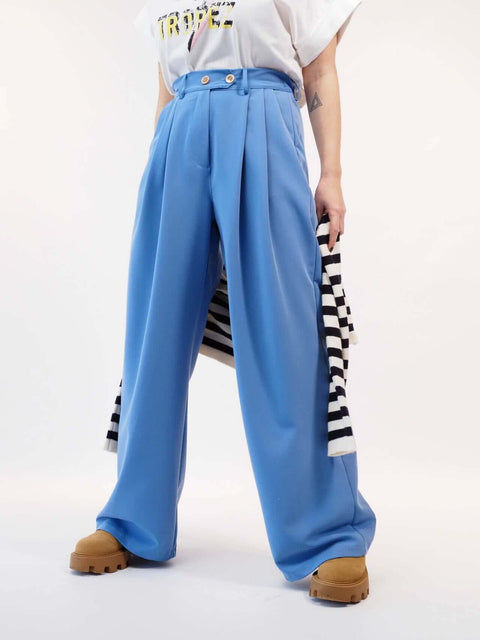 Calças pantalona, de tecido macio e fluído. Com fecho de correr metálico e de botões. Os bolsos laterais acrescentam uma utilidade extra à silhueta relaxada, enquanto a cintura elástica oferece um ajuste confortável.