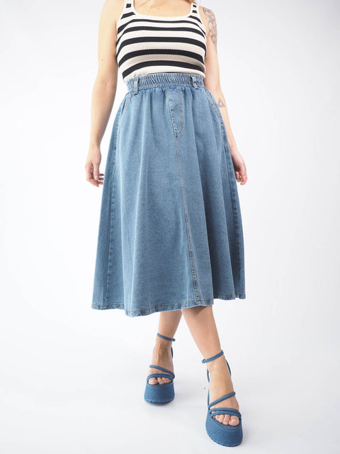 A saia de ganga midi, de corte evasé, é uma peça versátil, que está sempre em alta na moda. Ideal para mulheres que desejam um look moderno , esta peça pode ser combinada com diversos tipos de blusas e calçados, permitindo criar looks para várias ocasiões. Além disso, a saia de ganga midi é confortável, tem uma cintura elástica, e bolsos nas laterais, e é fácil de usar, o que a torna um item indispensável no guarda-roupa de qualquer mulher.