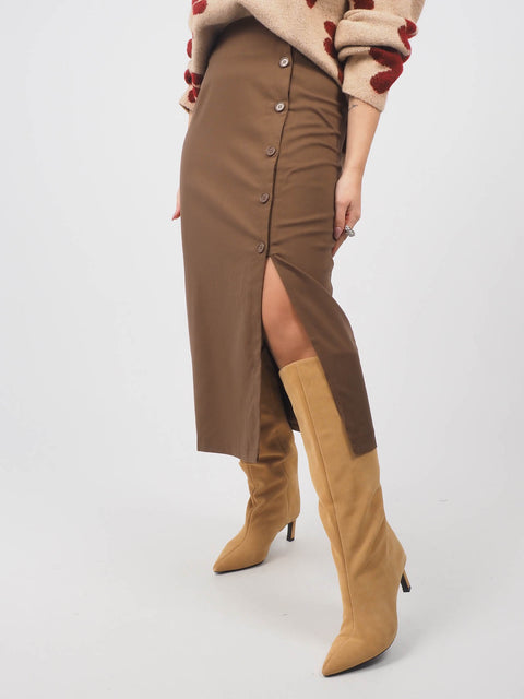 A nossa Saia Midi com Pormenor de Botões Laterais é a escolha perfeita para quem procura um visual elegante e moderno. Feita em tecido leve, esta saia oferece um caimento fluido que proporciona conforto e estilo em qualquer ocasião. Os botões laterais adicionam um detalhe sofisticado e único, enquanto o pormenor de abertura em baixo à frente confere um toque de ousadia e movimento ao design. Ideal para combinar com uma variedade de tops e acessórios, esta saia é versátil e perfeita para transitar facilmente entre looks casuais e mais formais.